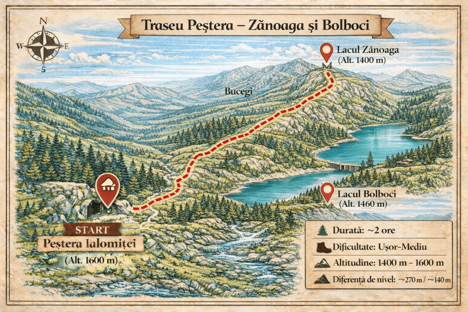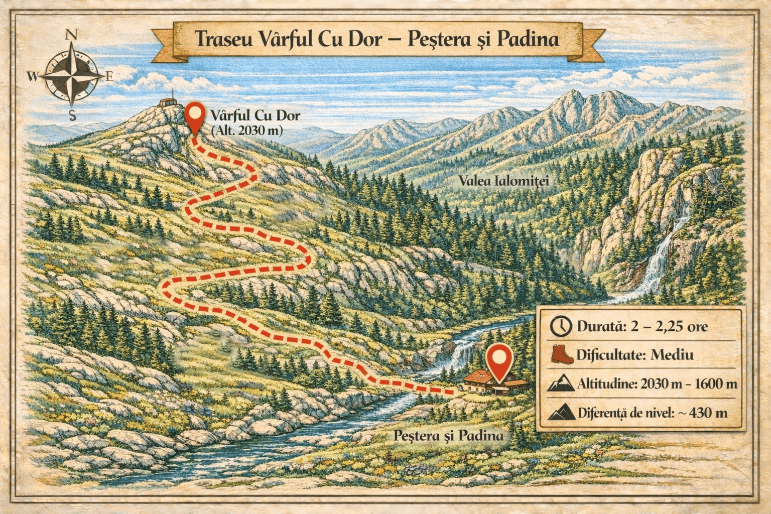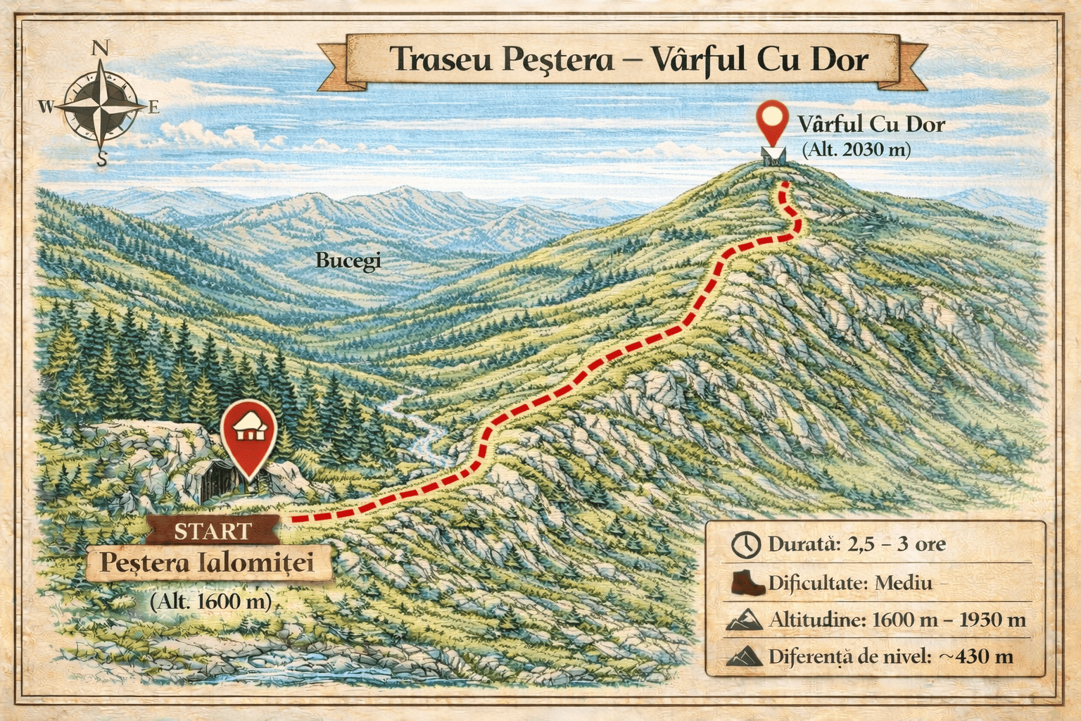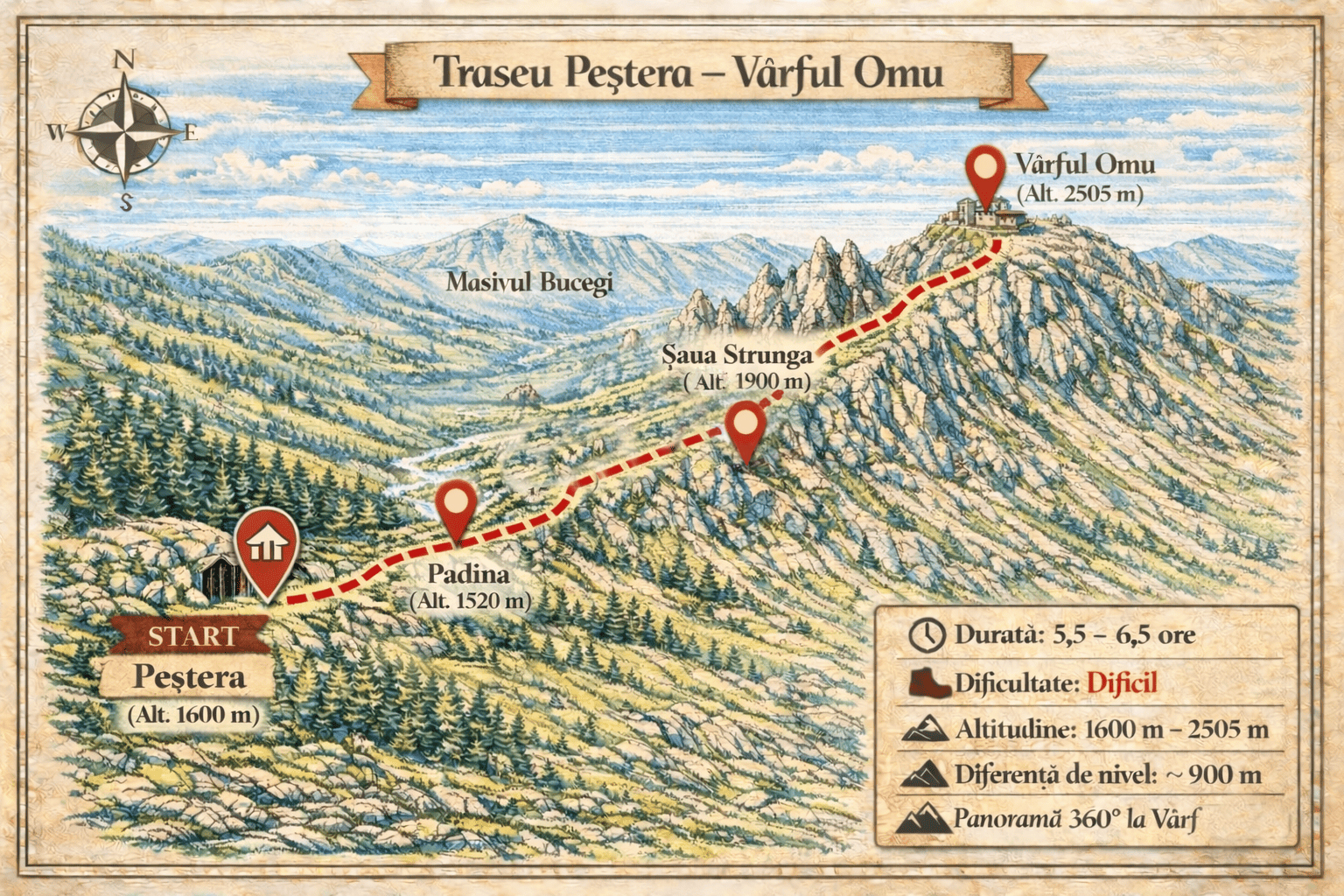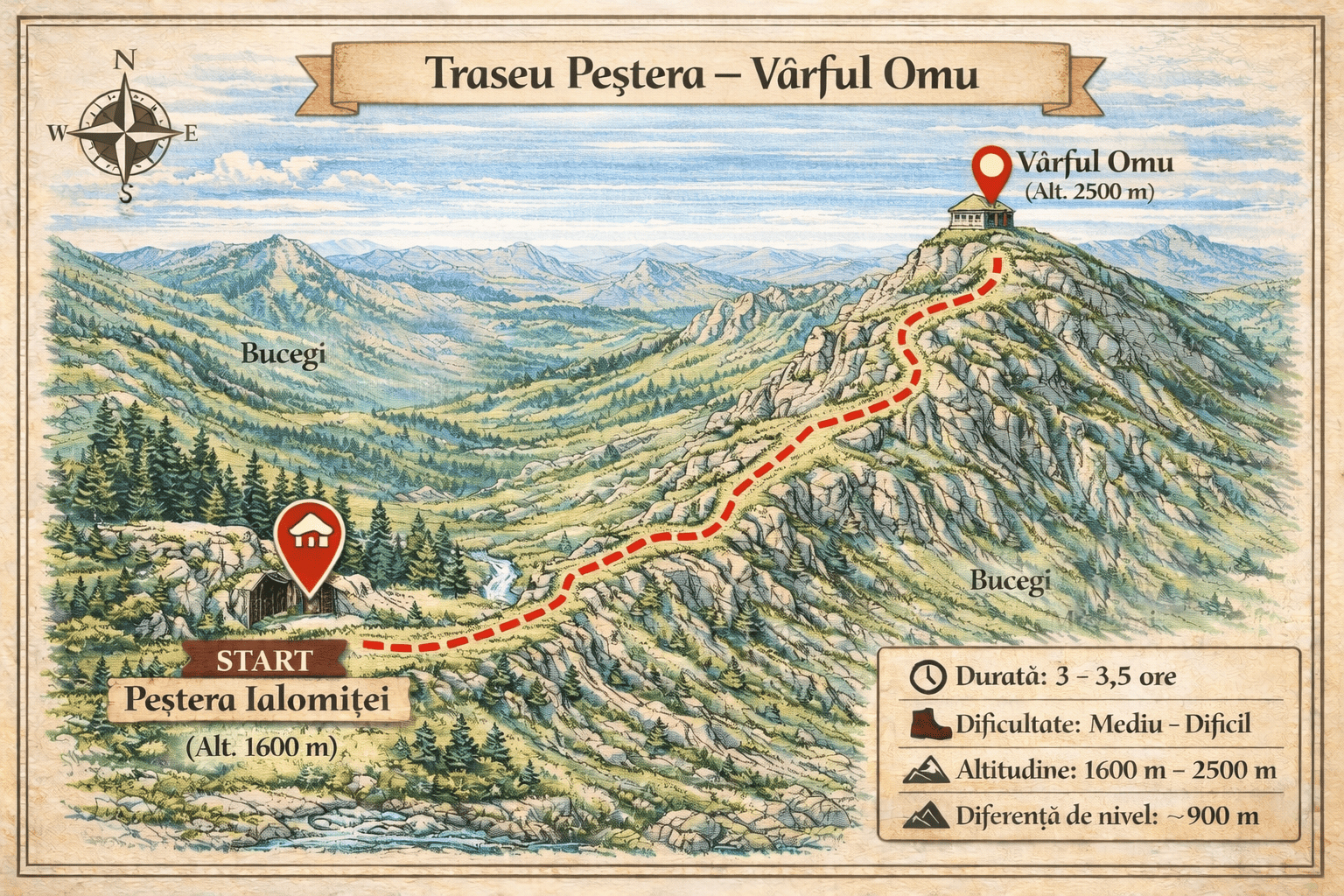 La aproximativ 135 – 145 de minute de PurpleVague, această drumeție pornește din inima văii Ialomiței și urcă constant spre cel mai înalt vârf al Bucegilor: Vârful Omu. Traseul te întâmpină inițial cu locuri umbroase și răcoroase lângă Peștera Ialomiței, loc binecunoscut pentru cavitatea calcaroasă ce oferă momente fascinante de explorare. Pe măsură ce urci,…