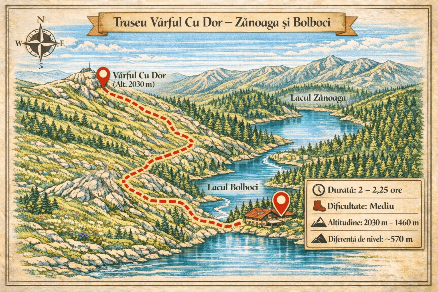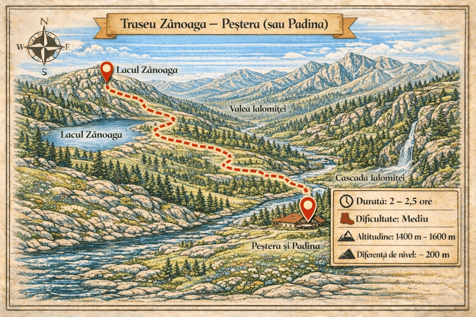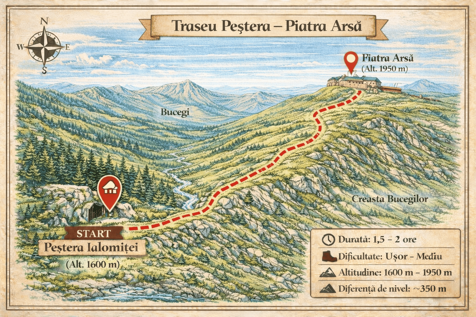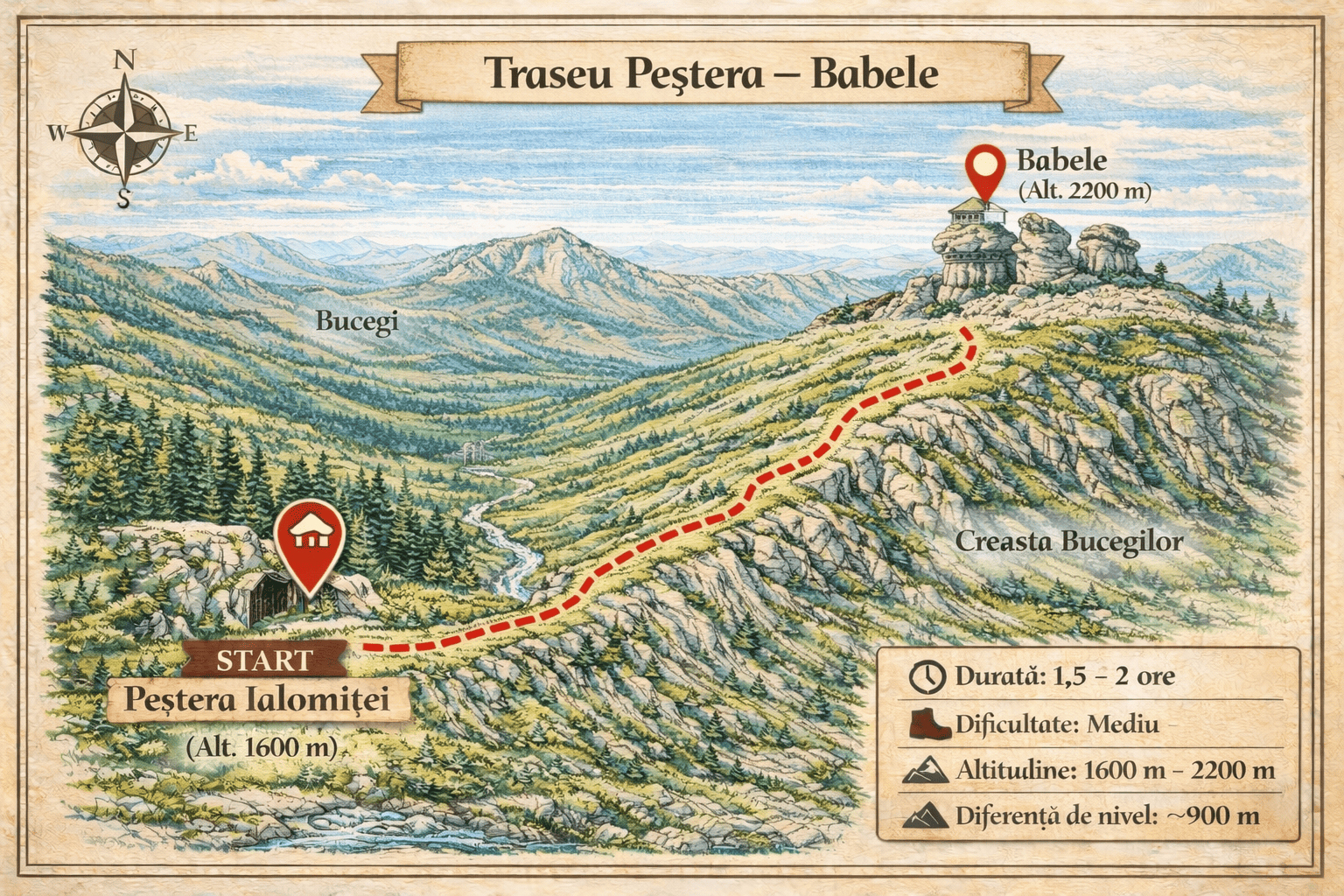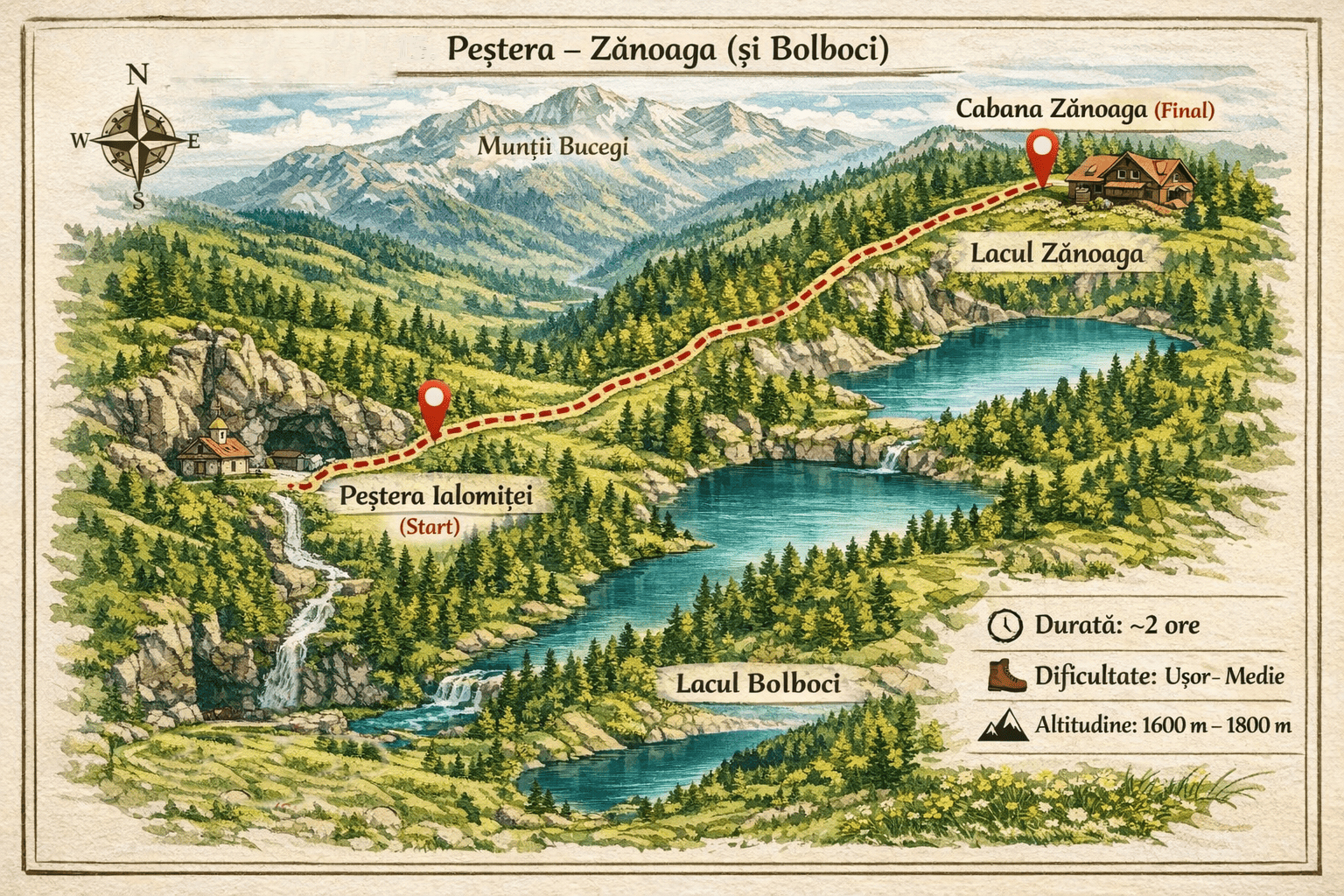 La aproximativ 135 – 145 de minute de PurpleVague, această drumeție pornește din inima văii Ialomiței și urcă constant spre cel mai înalt vârf al Bucegilor: Vârful Omu. Traseul te întâmpină inițial cu locuri umbroase și răcoroase lângă Peștera Ialomiței, loc binecunoscut pentru cavitatea calcaroasă ce oferă momente fascinante de explorare. Pe măsură ce urci,…