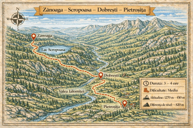 La aproximativ 130 de minute de PurpleVague, această drumeție începe în cadrul liniștit al lacurilor de munte Zănoaga și Scropoasa, urmând apoi Valea Ialomiței spre localitățile Dobrești și Pietroșița. Traseul oferă o combinație perfectă între ape liniștite, păduri dese și văi largi, cu priveliști asupra stâncilor masive ale Bucegilor. Deși este o drumeție mai lungă, modul…